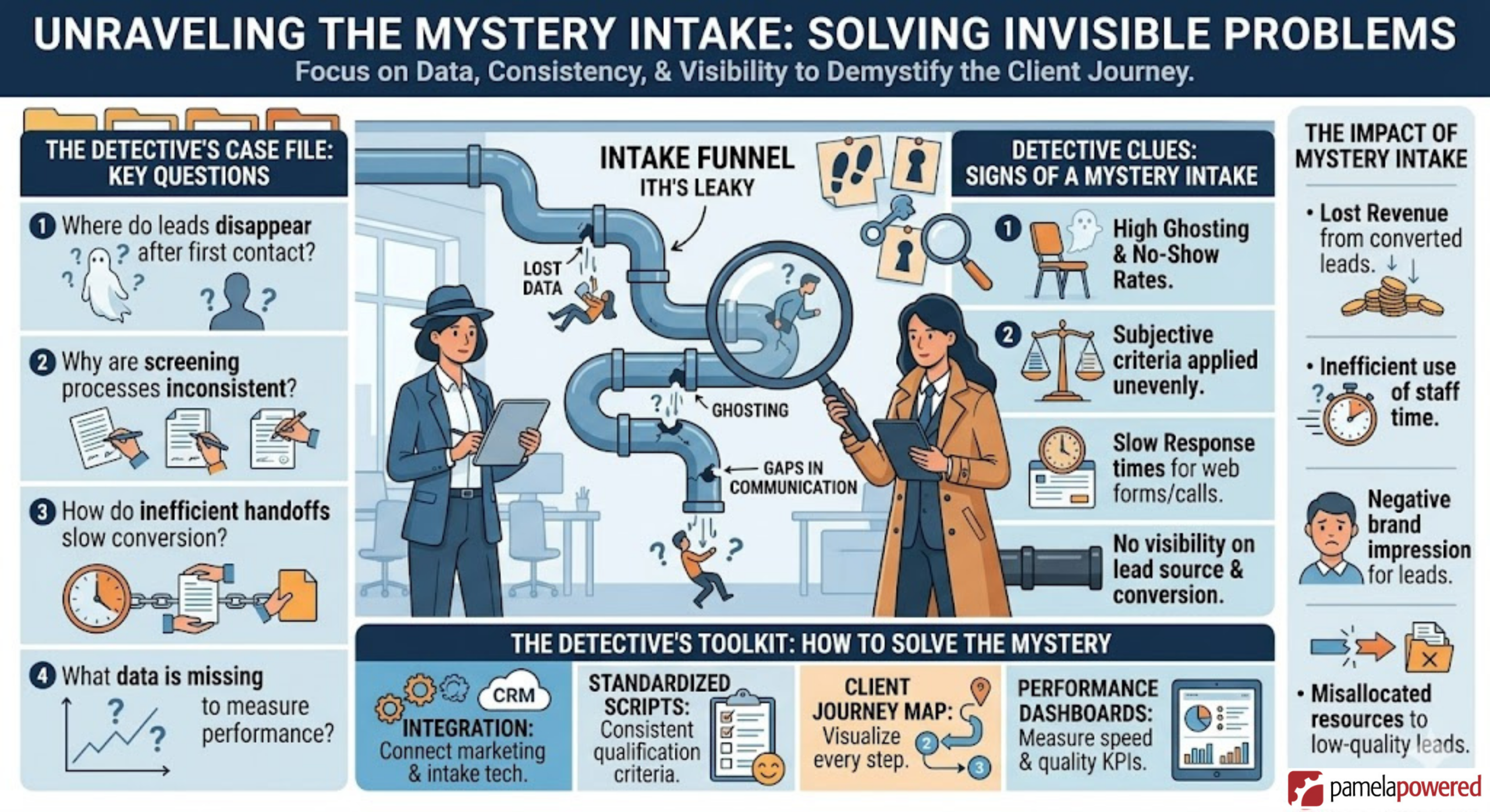 Same five stages of intake. Completely different breakdowns. Completely different solutions. You can’t copy and paste someone else’s answer because the mystery is always specific to the firm, its people, its practice areas, and its clients.